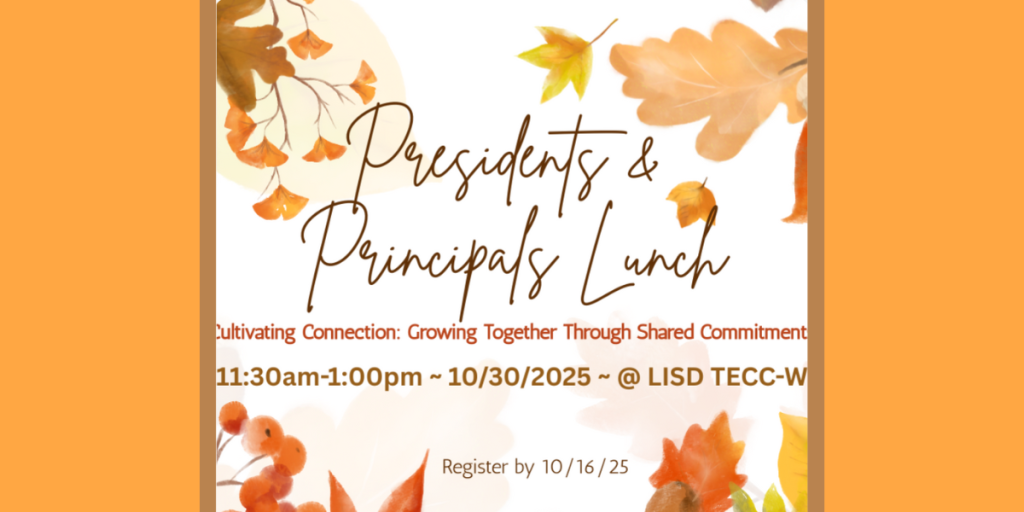 Please join us for the annual Presidents and Principals Luncheon on Thursday, October 30th, at TECC-West (1250A W Round Grove, Lewisville, TX 75067) from 11:30 am to 1:00 pm.